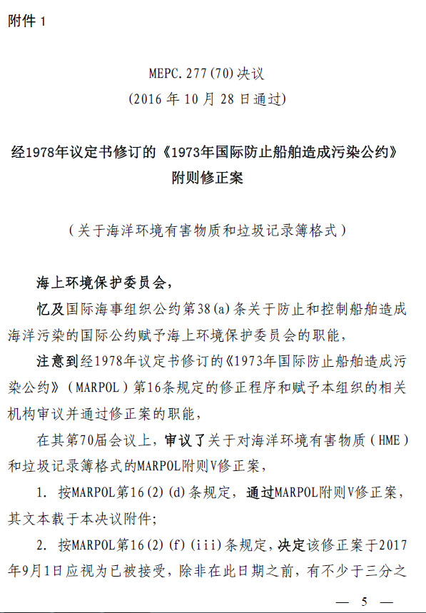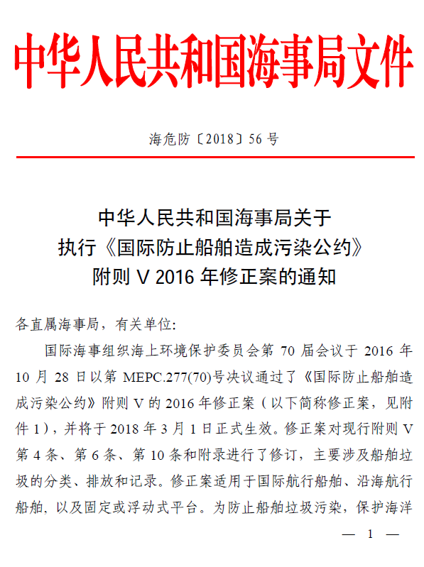 | 名称: | 中华人民共和国海事局关于执行《国际防止船舶造成污染公约》附则V 2016 年修正案的通知 | ||