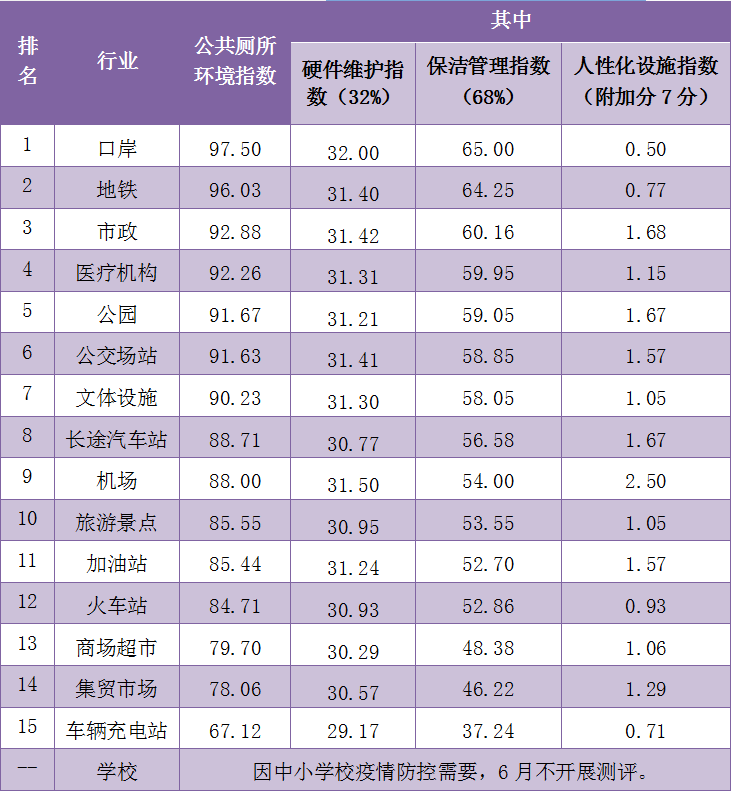 深圳6月行业公共厕所环境指数发布,口岸蝉联第一!