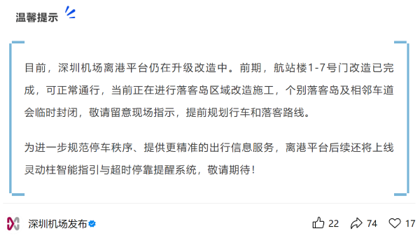 根据“深圳机场发布”的消息,机场离港平台目前还在升级改造中,个别落客岛和相邻车道会临时封闭。