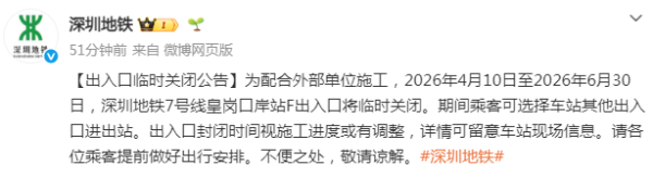 近期,深圳地铁发布公告为配合外部施工需要深圳地铁7号线皇岗口岸站F出入口临时关闭。