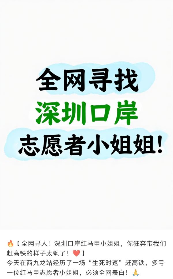 4月4日,一位前往郑州东的旅客在小红书发布《全网寻人!深圳口岸红马甲小姐姐,你狂奔带我们赶高铁的样子太飒了!》的笔记,动情讲述暖心经历。当时旅客一家三口携带多件行李,在拥挤的人群中焦急寻找检票口,眼看所乘高铁即将停止检票,十分慌乱。口岸志愿者主动上前询问,得知列车仅剩5分钟就停止检票后,立刻安抚旅客情绪,示意其带好孩子紧跟自己,随即一路狂奔引导,最终帮助旅客一家成功卡点登上高铁。旅客在笔记中感慨:“只记得她穿着印着‘深圳口岸’字样的红马甲,背影超飒!人超暖!声音温柔但带劲,那句‘冲刺’我记一辈子!”
