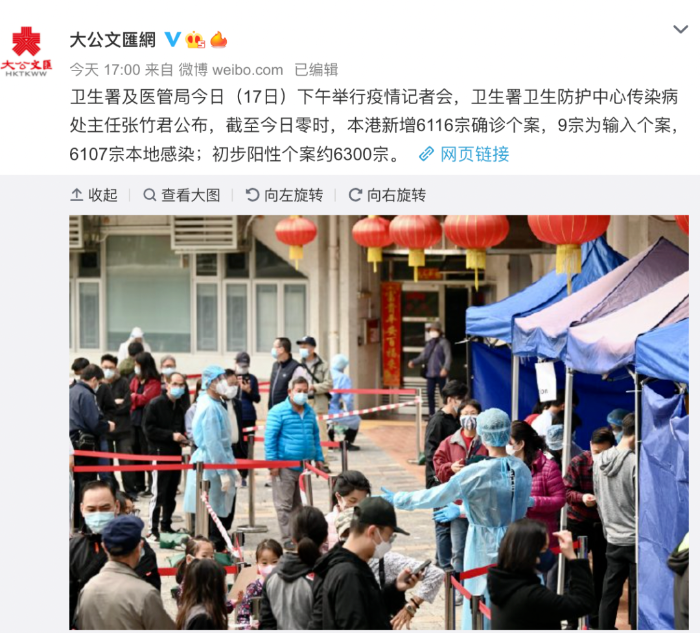 香港特区政府卫生署卫生防护中心2月17日公布,截至当日零时,香港新增6116例新冠肺炎确诊病例。当中9例为输入性病例,其他为本地病例。另外还有约6300例初步阳性病例。香港特区政府食物及卫生局副局长徐德义表示,香港第五波新冠疫情确诊数超越过去两年确诊总和。
