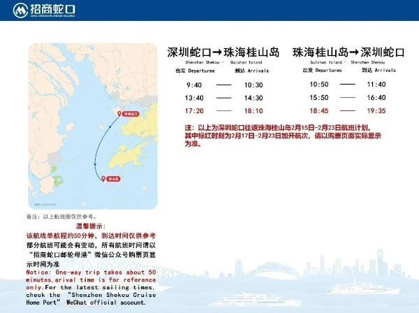 为迎接新春的到来,丰富旅客春节出行选择,深圳国际邮轮母港(蛇口邮轮中心)春节假期船班时刻表发布。