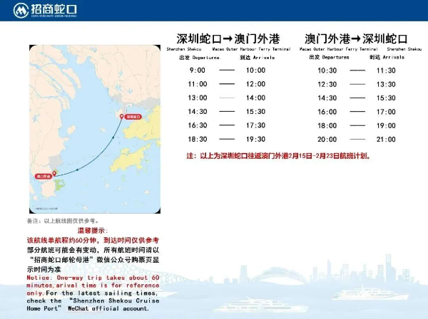 蛇口⇋澳门氹仔、外港 航班多、通关快、不拥挤,单程60分钟可到达,澳门氹仔/澳门外港是深圳市区往返澳门至快的出行优选。