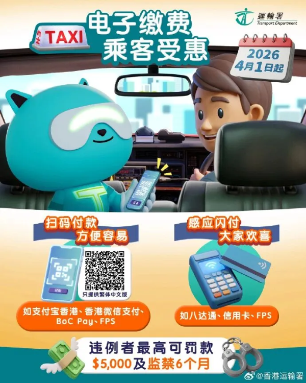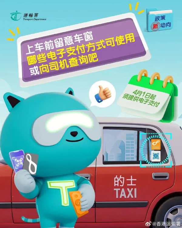 最新消息,4月1日起,香港所有的士司机至少要提供两种电子缴费方式,方便乘客出行。例如:一种二维码支付(如支付宝、微信支付、BoC Pay),一种非二维码支付(如八达通、信用卡或转数快)。乘客可留意车窗贴纸或问司机有哪种电子缴费方式,也可以继续支付现金。